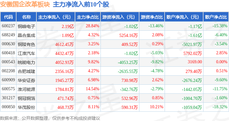 从资金流向上来看,当日安徽国企改革板块主力资金净流入9037.14万元,游资资金净流出1.17亿元,散户资金净流入2669.85万元。安徽国企改革板块个股资金流向见下表: