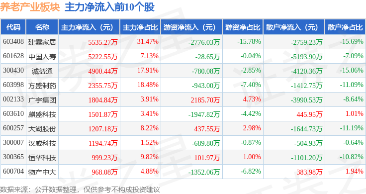 从资金流向上来看,当日养老产业板块主力资金净流出9.91亿元,游资资金净流出771.71万元,散户资金净流入9.99亿元。养老产业板块个股资金流向见下表: