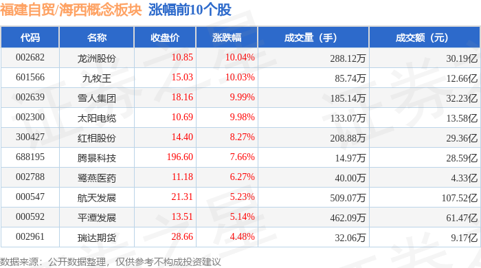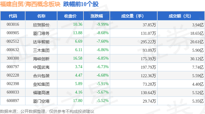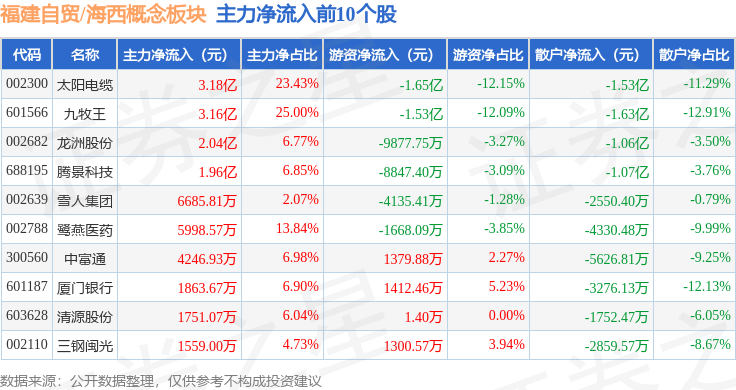 从资金流向上来看,当日福建自贸/海西概念板块主力资金净流出12.87亿元,游资资金净流出8.12亿元,散户资金净流入20.99亿元。福建自贸/海西概念板块个股资金流向见下表: