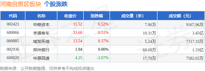 证券之星消息,12月12日河南自贸区板块较上一交易日上涨0.26%,中粮资本领涨。当日上证指数报收于3889.35,上涨0.41%。深证成指报收于13258.33,上涨0.84%。河南自贸区板块个股涨跌见下表: