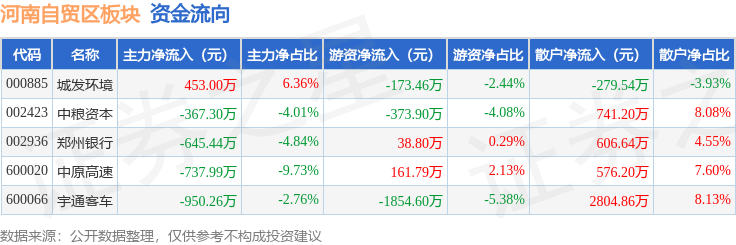 从资金流向上来看,当日河南自贸区板块主力资金净流出2247.99万元,游资资金净流出2201.37万元,散户资金净流入4449.35万元。河南自贸区板块个股资金流向见下表: