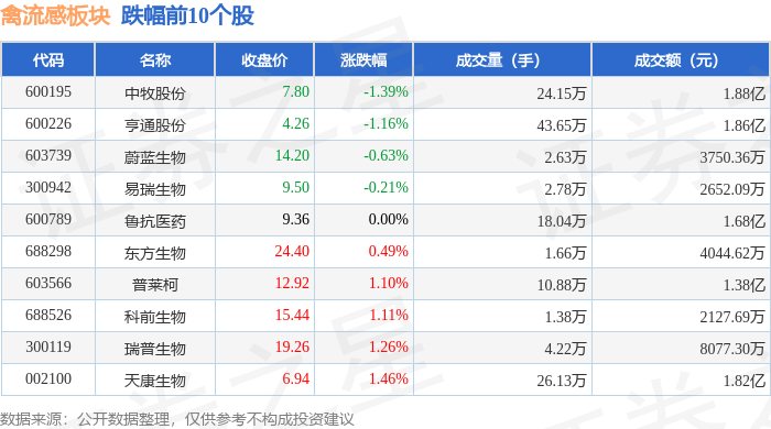 从资金流向上来看,当日禽流感板块主力资金净流出283.25万元,游资资金净流出4442.81万元,散户资金净流入4726.06万元。禽流感板块个股资金流向见下表: