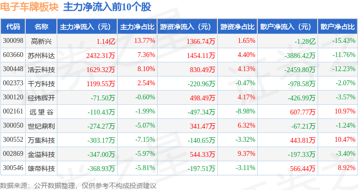 从资金流向上来看,当日电子车牌板块主力资金净流出971.55万元,游资资金净流出8301.39万元,散户资金净流入9272.93万元。电子车牌板块个股资金流向见下表: