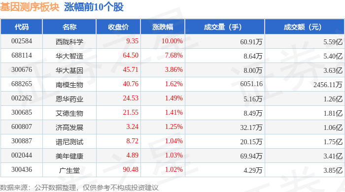 从资金流向上来看,当日基因测序板块主力资金净流入5854.41万元,游资资金净流出6298.38万元,散户资金净流入443.98万元。基因测序板块个股资金流向见下表: