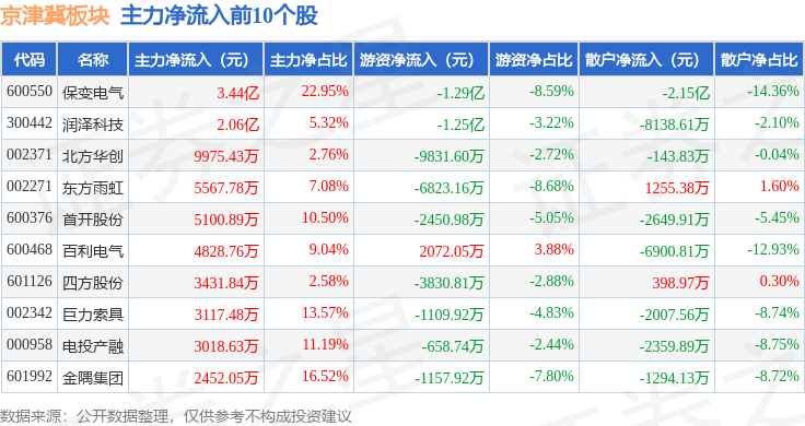 从资金流向上来看,当日京津冀板块主力资金净流出12.71亿元,游资资金净流出1.33亿元,散户资金净流入14.04亿元。京津冀板块个股资金流向见下表: