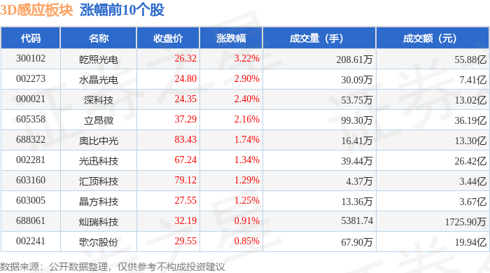 证券之星消息,12月12日3D感应板块较上一交易日上涨0.97%,乾照光电领涨。当日上证指数报收于3889.35,上涨0.41%。深证成指报收于13258.33,上涨0.84%。3D感应板块个股涨跌见下表: