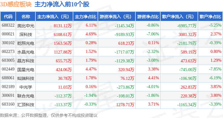 从资金流向上来看,当日3D感应板块主力资金净流出3.51亿元,游资资金净流出1.8亿元,散户资金净流入5.31亿元。3D感应板块个股资金流向见下表: