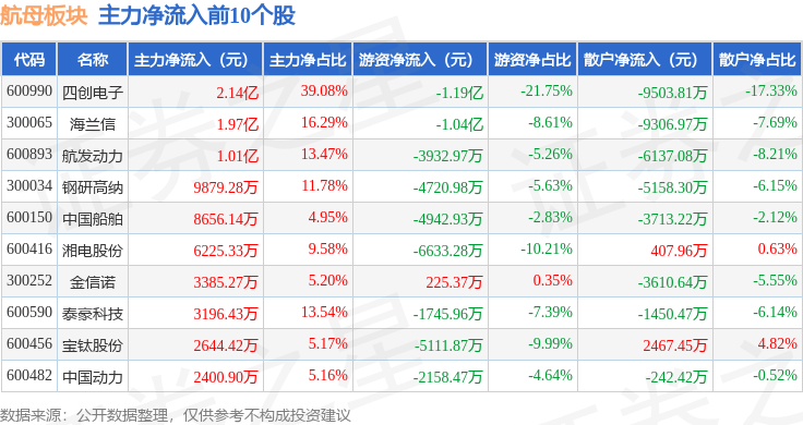 从资金流向上来看,当日航母板块主力资金净流入4.21亿元,游资资金净流出4.83亿元,散户资金净流入6218.71万元。航母板块个股资金流向见下表: