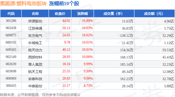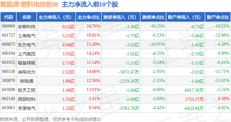 从资金流向上来看,当日氢能源/燃料电池板块主力资金净流出11.21亿元,游资资金净流出7.41亿元,散户资金净流入18.62亿元。氢能源/燃料电池板块个股资金流向见下表: