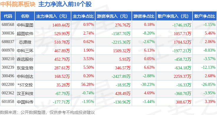 从资金流向上来看,当日中科院系板块主力资金净流出13.64亿元,游资资金净流入4.69亿元,散户资金净流入8.95亿元。中科院系板块个股资金流向见下表: