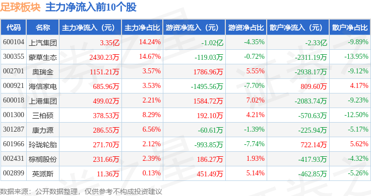 从资金流向上来看,当日足球板块主力资金净流入1.35亿元,游资资金净流出1.37亿元,散户资金净流入180.96万元。足球板块个股资金流向见下表: