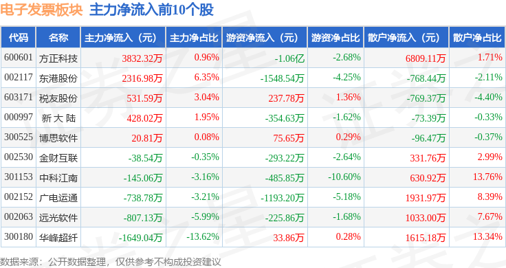 从资金流向上来看,当日电子发票板块主力资金净流出2.95亿元,游资资金净流出1.23亿元,散户资金净流入4.18亿元。电子发票板块个股资金流向见下表: