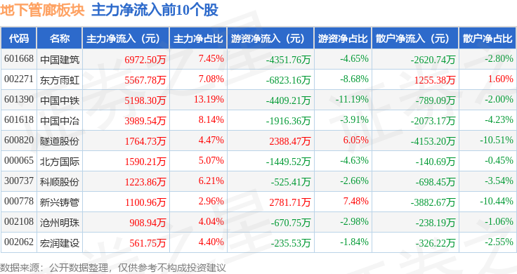 从资金流向上来看,当日地下管廊板块主力资金净流入9294.18万元,游资资金净流出1.35亿元,散户资金净流入4233.29万元。地下管廊板块个股资金流向见下表: