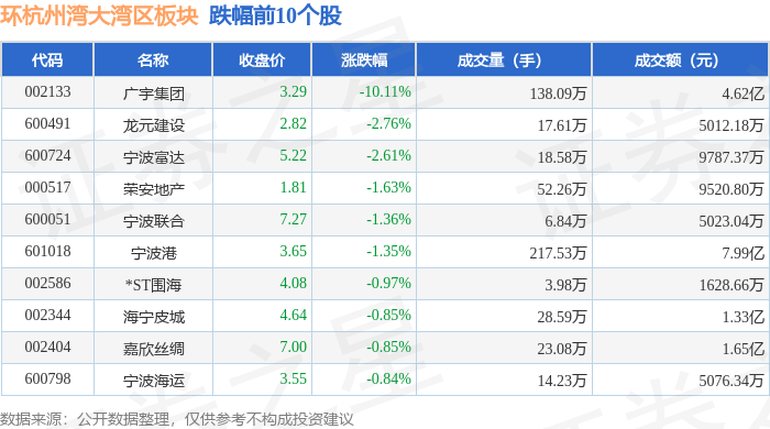 证券之星消息,12月12日环杭州湾大湾区板块较上一交易日下跌0.48%,广宇集团领跌。当日上证指数报收于3889.35,上涨0.41%。深证成指报收于13258.33,上涨0.84%。环杭州湾大湾区板块个股涨跌见下表: