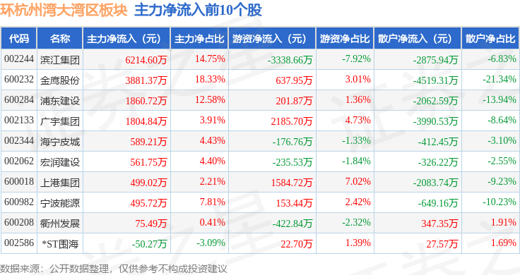 从资金流向上来看,当日环杭州湾大湾区板块主力资金净流入5363.89万元,游资资金净流入1.62亿元,散户资金净流出2.15亿元。环杭州湾大湾区板块个股资金流向见下表: