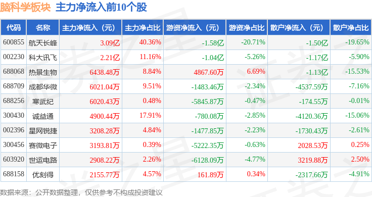 从资金流向上来看,当日脑科学板块主力资金净流入5.66亿元,游资资金净流出5.08亿元,散户资金净流出5854.09万元。脑科学板块个股资金流向见下表: