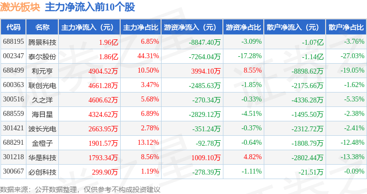 从资金流向上来看,当日激光板块主力资金净流出5.7亿元,游资资金净流出1.03亿元,散户资金净流入6.73亿元。激光板块个股资金流向见下表: