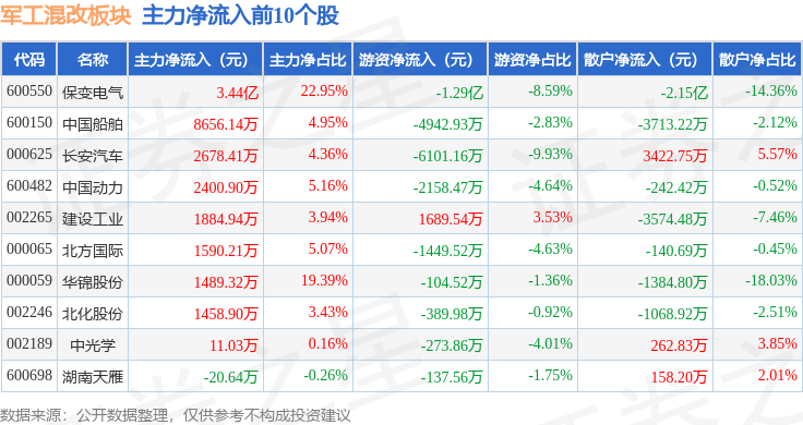 从资金流向上来看,当日军工混改板块主力资金净流入1.56亿元,游资资金净流出2.12亿元,散户资金净流入5588.85万元。军工混改板块个股资金流向见下表: