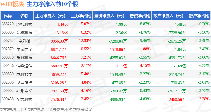 从资金流向上来看,当日WiFi板块主力资金净流出6382.15万元,游资资金净流出5.43亿元,散户资金净流入6.07亿元。WiFi板块个股资金流向见下表: