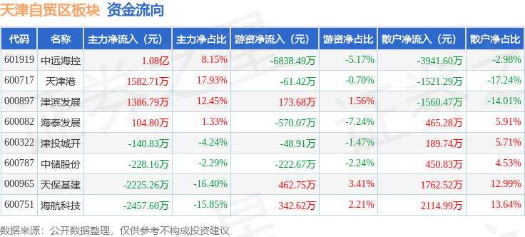 从资金流向上来看,当日天津自贸区板块主力资金净流入8802.54万元,游资资金净流出6762.53万元,散户资金净流出2040.01万元。天津自贸区板块个股资金流向见下表: