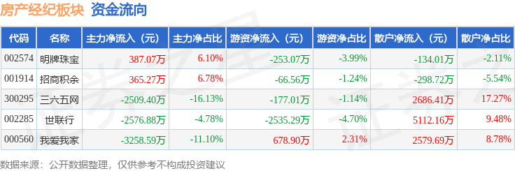 从资金流向上来看,当日房产经纪板块主力资金净流出7592.52万元,游资资金净流出2353.02万元,散户资金净流入9945.54万元。房产经纪板块个股资金流向见下表: