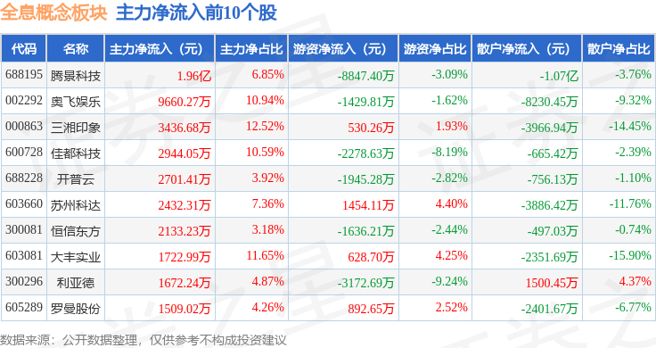 从资金流向上来看,当日全息概念板块主力资金净流入2.22亿元,游资资金净流出2.0亿元,散户资金净流出2113.96万元。全息概念板块个股资金流向见下表: