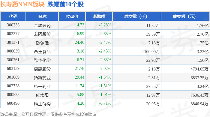 证券之星消息,12月12日长寿药NMN板块较上一交易日下跌0.1%,金城医药领跌。当日上证指数报收于3889.35,上涨0.41%。深证成指报收于13258.33,上涨0.84%。长寿药NMN板块个股涨跌见下表: