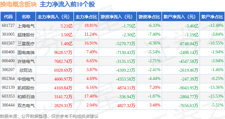从资金流向上来看,当日换电概念板块主力资金净流入11.28亿元,游资资金净流出6.01亿元,散户资金净流出5.27亿元。换电概念板块个股资金流向见下表: