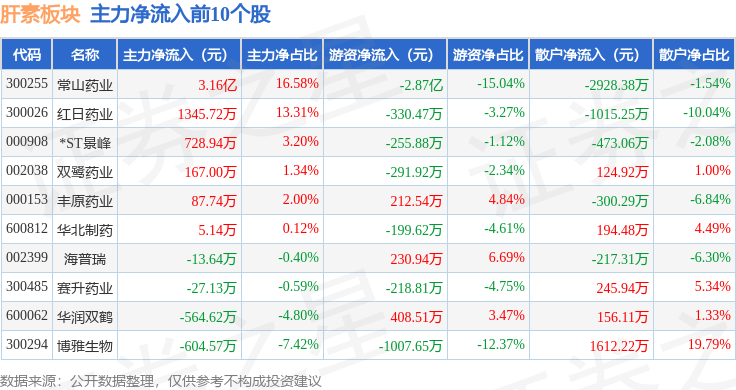 从资金流向上来看,当日肝素板块主力资金净流入2.01亿元,游资资金净流出2.9亿元,散户资金净流入8883.57万元。肝素板块个股资金流向见下表: