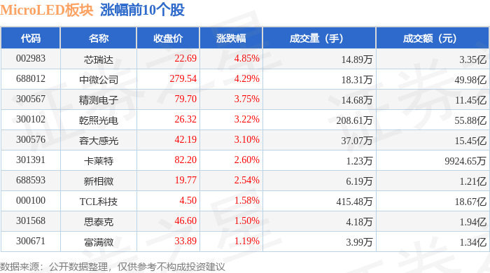 证券之星消息,12月12日MicroLED板块较上一交易日上涨1.12%,芯瑞达领涨。当日上证指数报收于3889.35,上涨0.41%。深证成指报收于13258.33,上涨0.84%。MicroLED板块个股涨跌见下表: