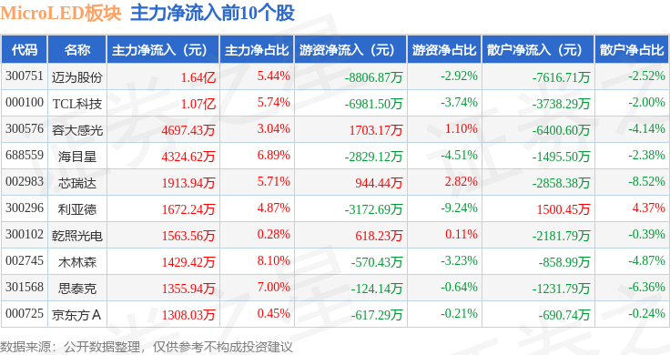 从资金流向上来看,当日MicroLED板块主力资金净流出8.64亿元,游资资金净流入2724.68万元,散户资金净流入8.36亿元。MicroLED板块个股资金流向见下表: