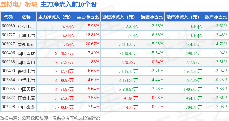 从资金流向上来看,当日虚拟电厂板块主力资金净流入11.88亿元,游资资金净流出8.59亿元,散户资金净流出3.29亿元。虚拟电厂板块个股资金流向见下表:
