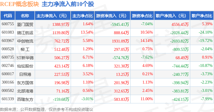 从资金流向上来看,当日RCEP概念板块主力资金净流出1.39亿元,游资资金净流入412.19万元,散户资金净流入1.35亿元。RCEP概念板块个股资金流向见下表: