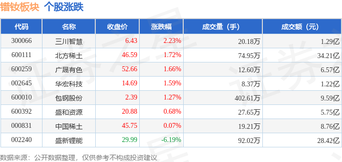 证券之星消息,12月12日镨钕板块较上一交易日上涨0.76%,三川智慧领涨。当日上证指数报收于3889.35,上涨0.41%。深证成指报收于13258.33,上涨0.84%。镨钕板块个股涨跌见下表: