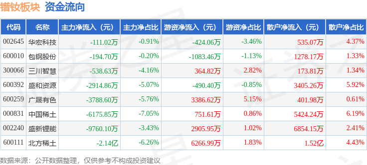 从资金流向上来看,当日镨钕板块主力资金净流出4.49亿元,游资资金净流入1.17亿元,散户资金净流入3.32亿元。镨钕板块个股资金流向见下表: