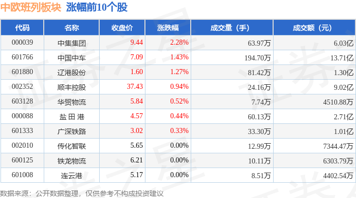 证券之星消息,12月12日中欧班列板块较上一交易日上涨0.39%,中集集团领涨。当日上证指数报收于3889.35,上涨0.41%。深证成指报收于13258.33,上涨0.84%。中欧班列板块个股涨跌见下表: