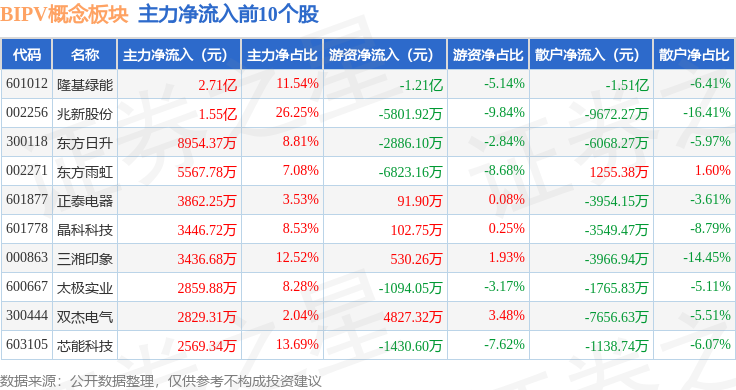 从资金流向上来看,当日BIPV概念板块主力资金净流入4.57亿元,游资资金净流出4.51亿元,散户资金净流出562.21万元。BIPV概念板块个股资金流向见下表: