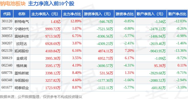 从资金流向上来看,当日钠电池板块主力资金净流出30.32亿元,游资资金净流出3.57亿元,散户资金净流入33.89亿元。钠电池板块个股资金流向见下表: