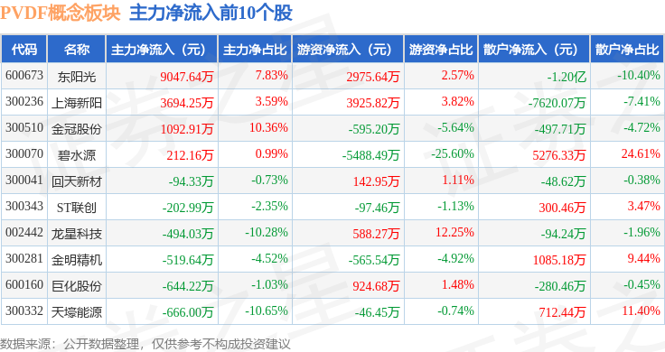 从资金流向上来看,当日PVDF概念板块主力资金净流出5.57亿元,游资资金净流入1.41亿元,散户资金净流入4.16亿元。PVDF概念板块个股资金流向见下表: