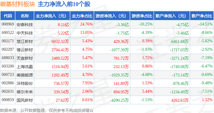 从资金流向上来看,当日碳基材料板块主力资金净流入12.7亿元,游资资金净流出5.03亿元,散户资金净流出7.68亿元。碳基材料板块个股资金流向见下表: