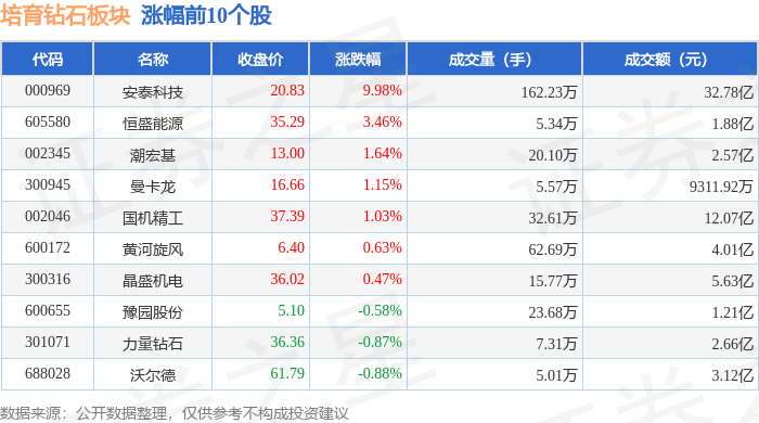 证券之星消息,12月12日培育钻石板块较上一交易日上涨0.86%,安泰科技领涨。当日上证指数报收于3889.35,上涨0.41%。深证成指报收于13258.33,上涨0.84%。培育钻石板块个股涨跌见下表: