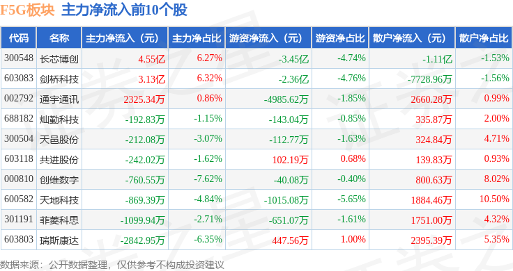 从资金流向上来看,当日F5G板块主力资金净流出2.69亿元,游资资金净流出2466.82万元,散户资金净流入2.94亿元。F5G板块个股资金流向见下表: