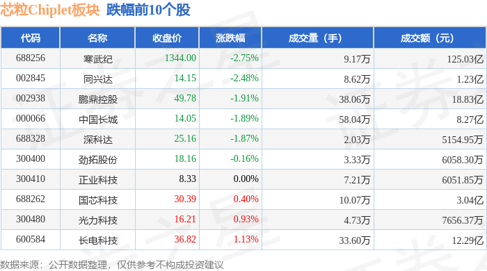证券之星消息,12月12日芯粒Chiplet板块较上一交易日下跌0.6%,寒武纪领跌。当日上证指数报收于3889.35,上涨0.41%。深证成指报收于13258.33,上涨0.84%。芯粒Chiplet板块个股涨跌见下表: