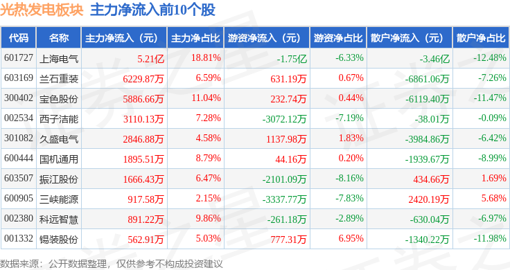 从资金流向上来看,当日光热发电板块主力资金净流入7.31亿元,游资资金净流出2.77亿元,散户资金净流出4.54亿元。光热发电板块个股资金流向见下表: