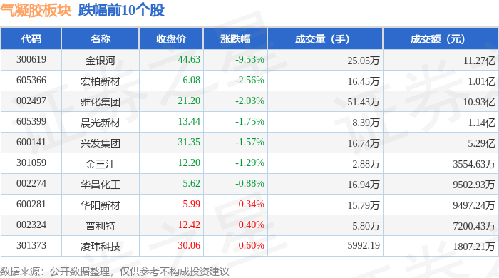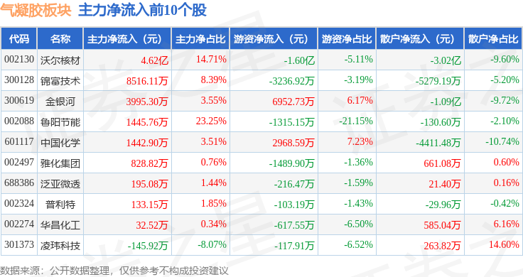 从资金流向上来看,当日气凝胶板块主力资金净流入4.78亿元,游资资金净流出1.22亿元,散户资金净流出3.56亿元。气凝胶板块个股资金流向见下表:
