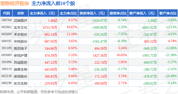 从资金流向上来看,当日宠物经济板块主力资金净流出2.3亿元,游资资金净流出2574.92万元,散户资金净流入2.56亿元。宠物经济板块个股资金流向见下表: