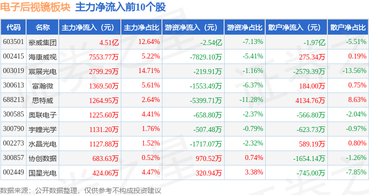 从资金流向上来看,当日电子后视镜板块主力资金净流出6.37亿元,游资资金净流入1.57亿元,散户资金净流入4.8亿元。电子后视镜板块个股资金流向见下表: