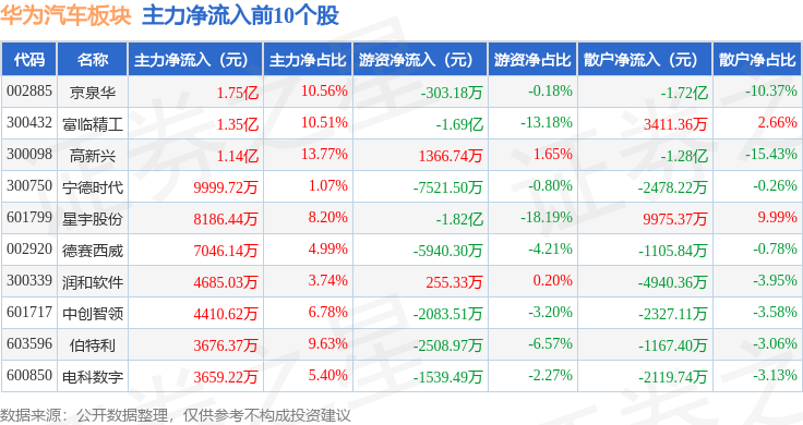 从资金流向上来看,当日华为汽车板块主力资金净流出16.41亿元,游资资金净流出1.17亿元,散户资金净流入17.59亿元。华为汽车板块个股资金流向见下表: