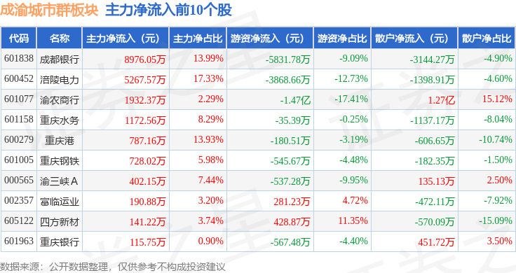 从资金流向上来看,当日成渝城市群板块主力资金净流出862.67万元,游资资金净流出2.57亿元,散户资金净流入2.66亿元。成渝城市群板块个股资金流向见下表: