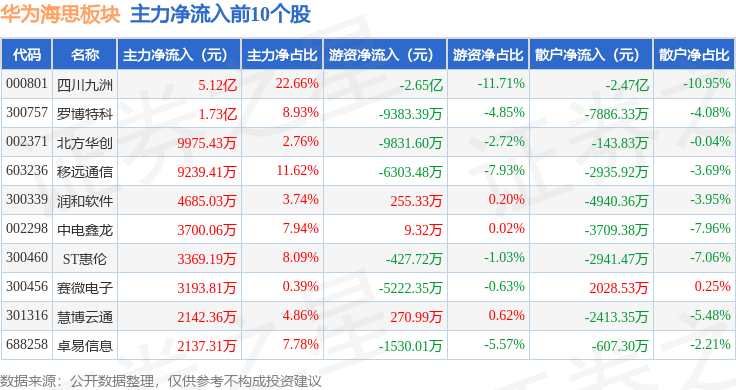 从资金流向上来看,当日华为海思板块主力资金净流出3.67亿元,游资资金净流出9.26亿元,散户资金净流入12.93亿元。华为海思板块个股资金流向见下表: